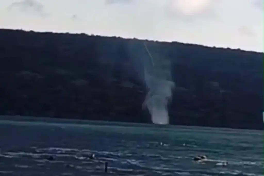 Video tersebut memperlihatkan sebuah kolom angin yang berputar kencang, membentang dari awan gelap hingga menyentuh permukaan laut.